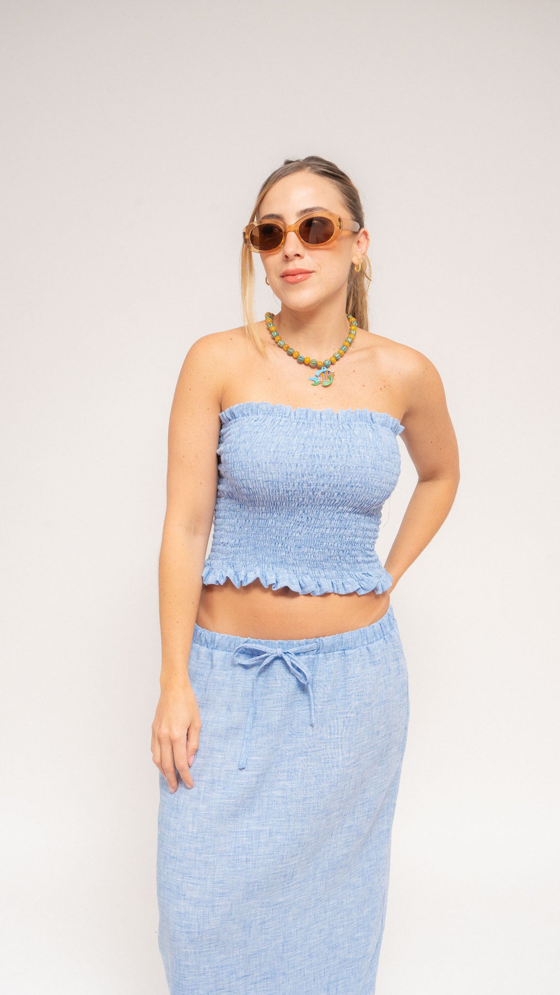Este conjunto en lino azul con top enresortado y falda larga nace para vivir el verano desde la orilla. Diseñado para climas tropicales y para moverse con libertad.