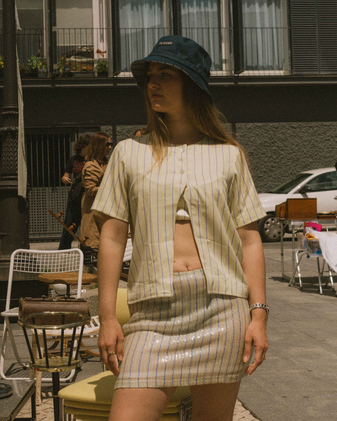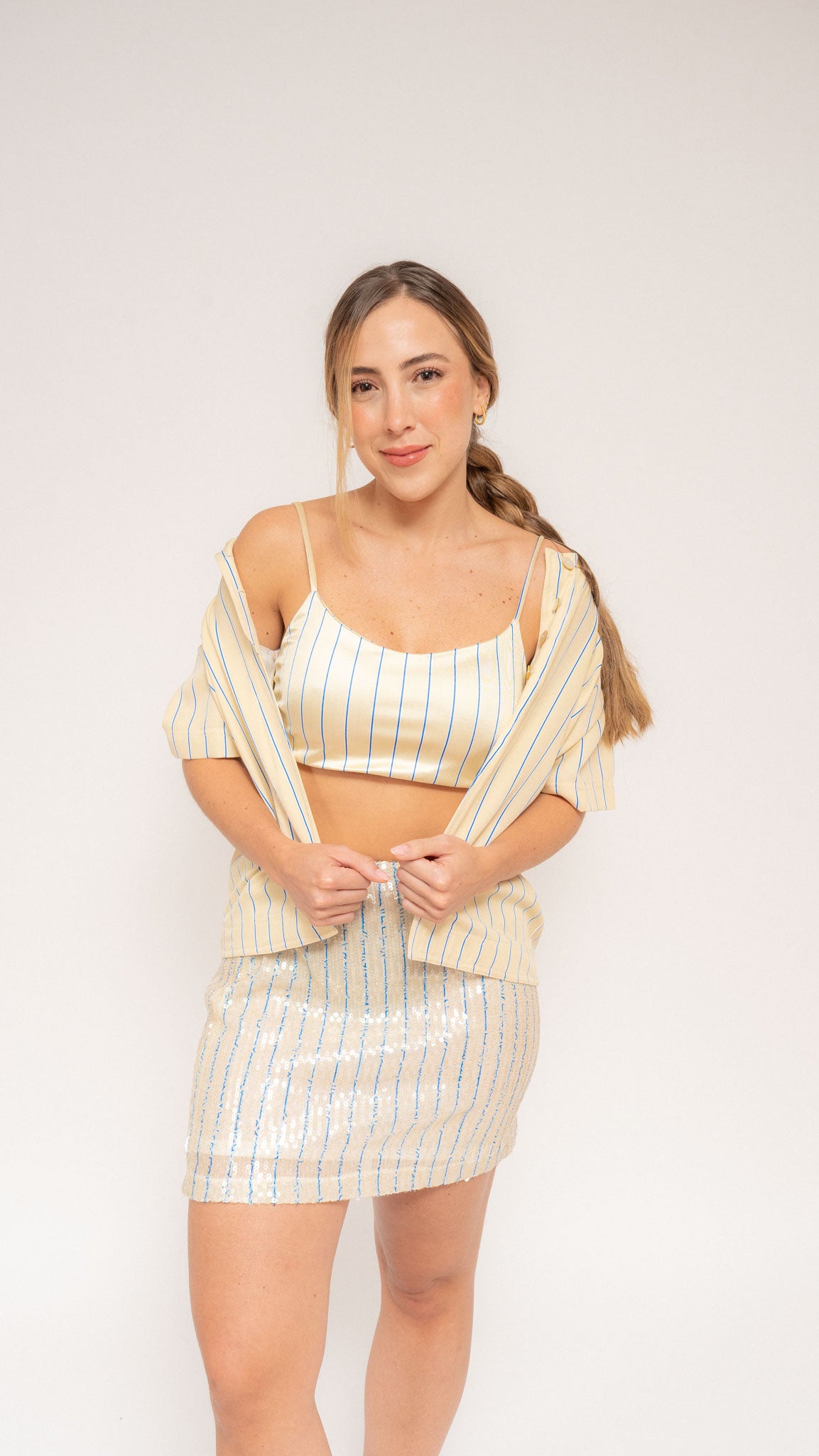 Mini falda de lentejuelas forrada, con una horma que favorece la silueta femenina y aporta un brillo sutil y tropical. Su diseño de rayas estiliza y le da un toque especial al look. Ideal para llevar en conjunto con la camisa tipo beisbolera y lograr un outfit cool, tanto de día como de noche.