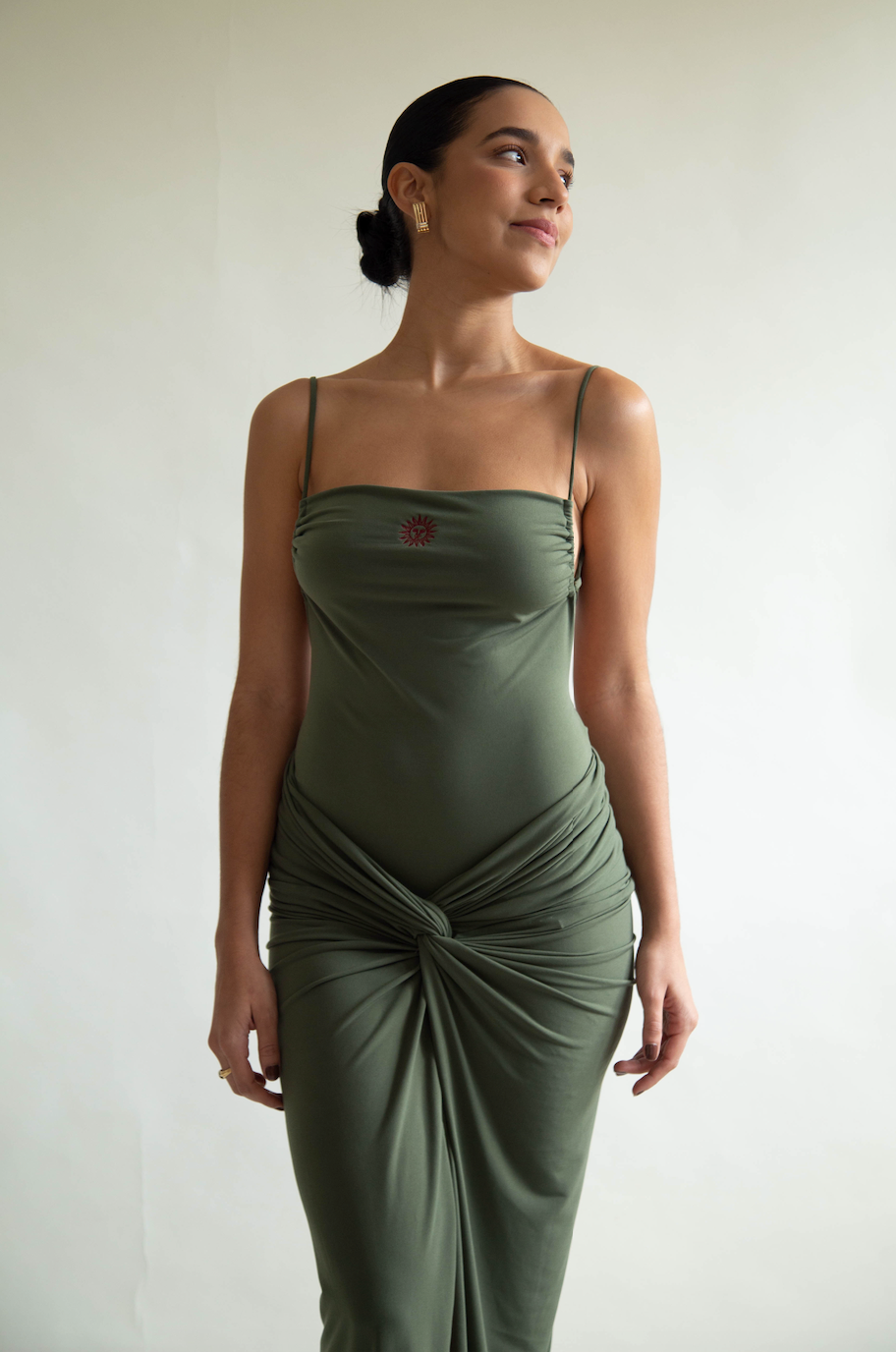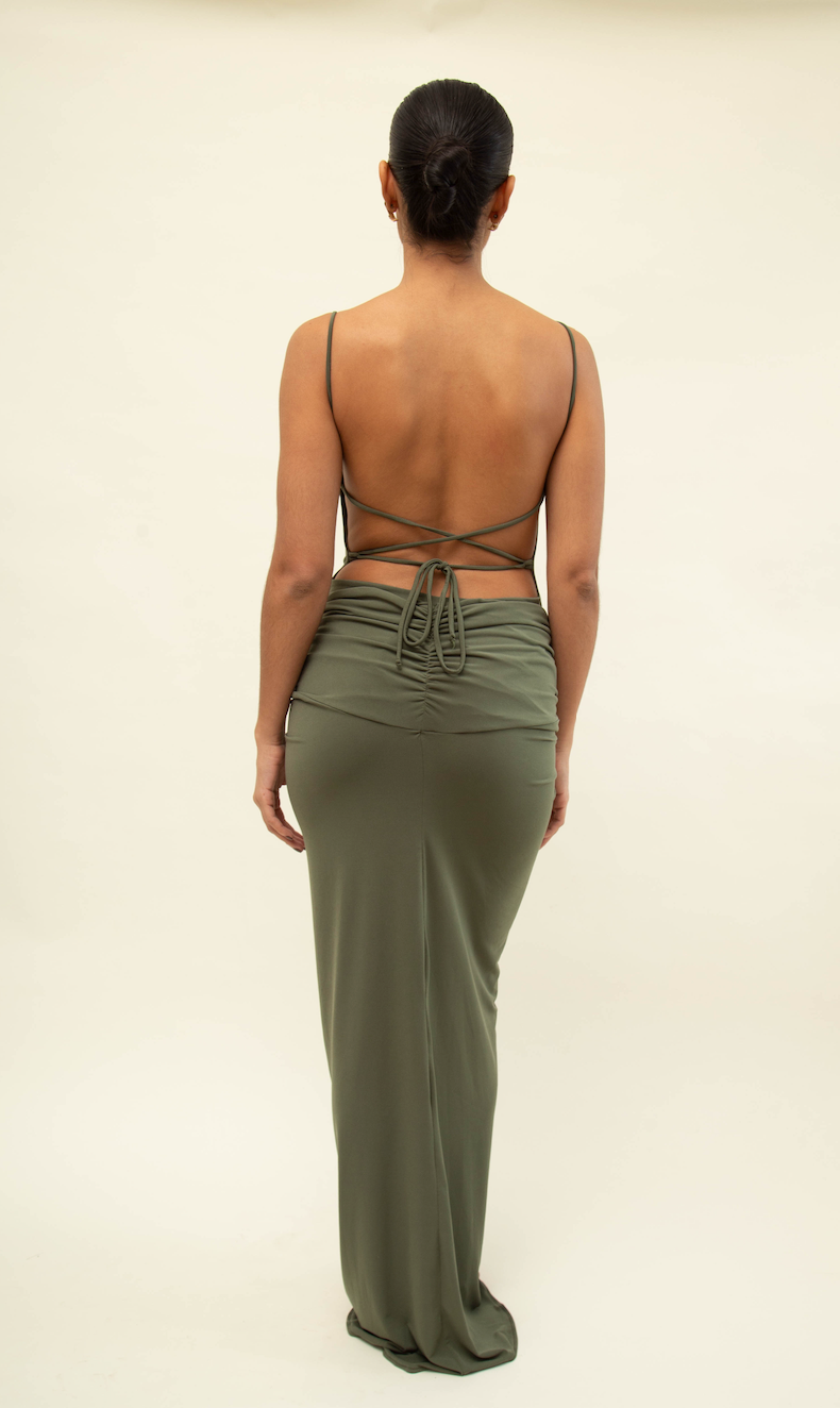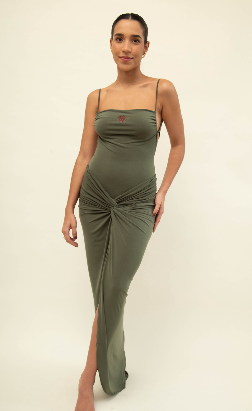 Falda tipo sirena en tejido elástico que realza la silueta, combinada con un body del mismo tono y bordado de sol. El body es ajustable y de talla única, perfecto para un look sofisticado.